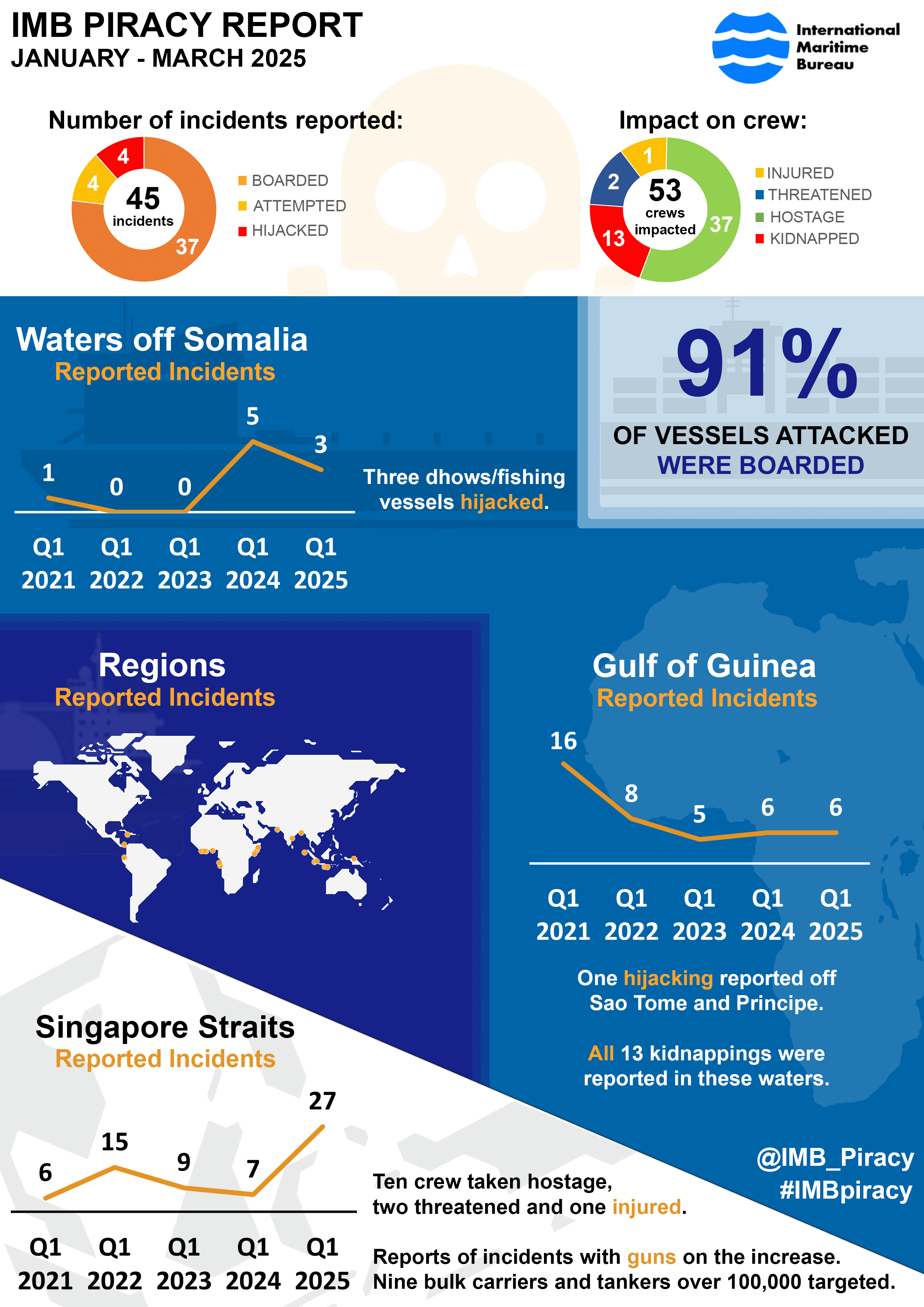 On 15 April, the International Chamber of Commerce’s International Maritime Bureau (IMB) released its 2025 Q1 report on Piracy and Armed Robbery Against Ships recording a total of 45 incidents – a 35 percent increase compared to the same period in 2024, driven by a spike of incidents in the Singapore Straits. Of the incidents reported, 37 vessels were boarded, four were hijacked and four had attempted attacks. The threat to crew safety remains high with 37 crew members taken hostage, 13 kidnapped, two threatened and one injured.