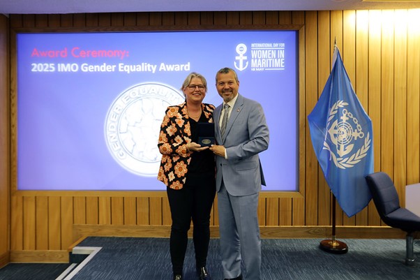 Karin Orsel receiving the Gender Equality Award for 2025 from the IMO Secretary General Arsenio Dominguez.